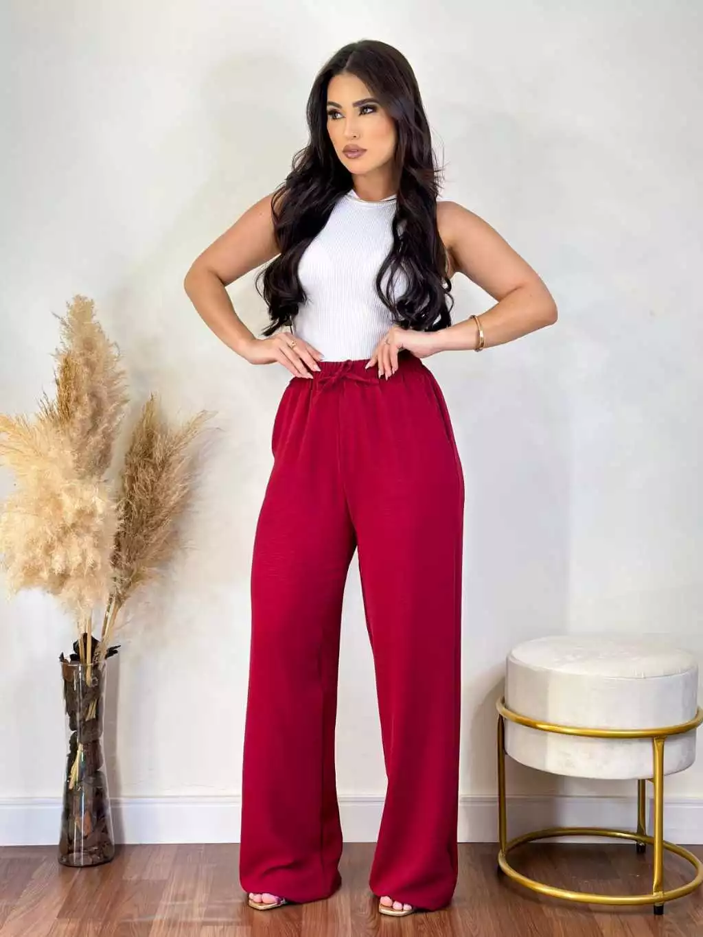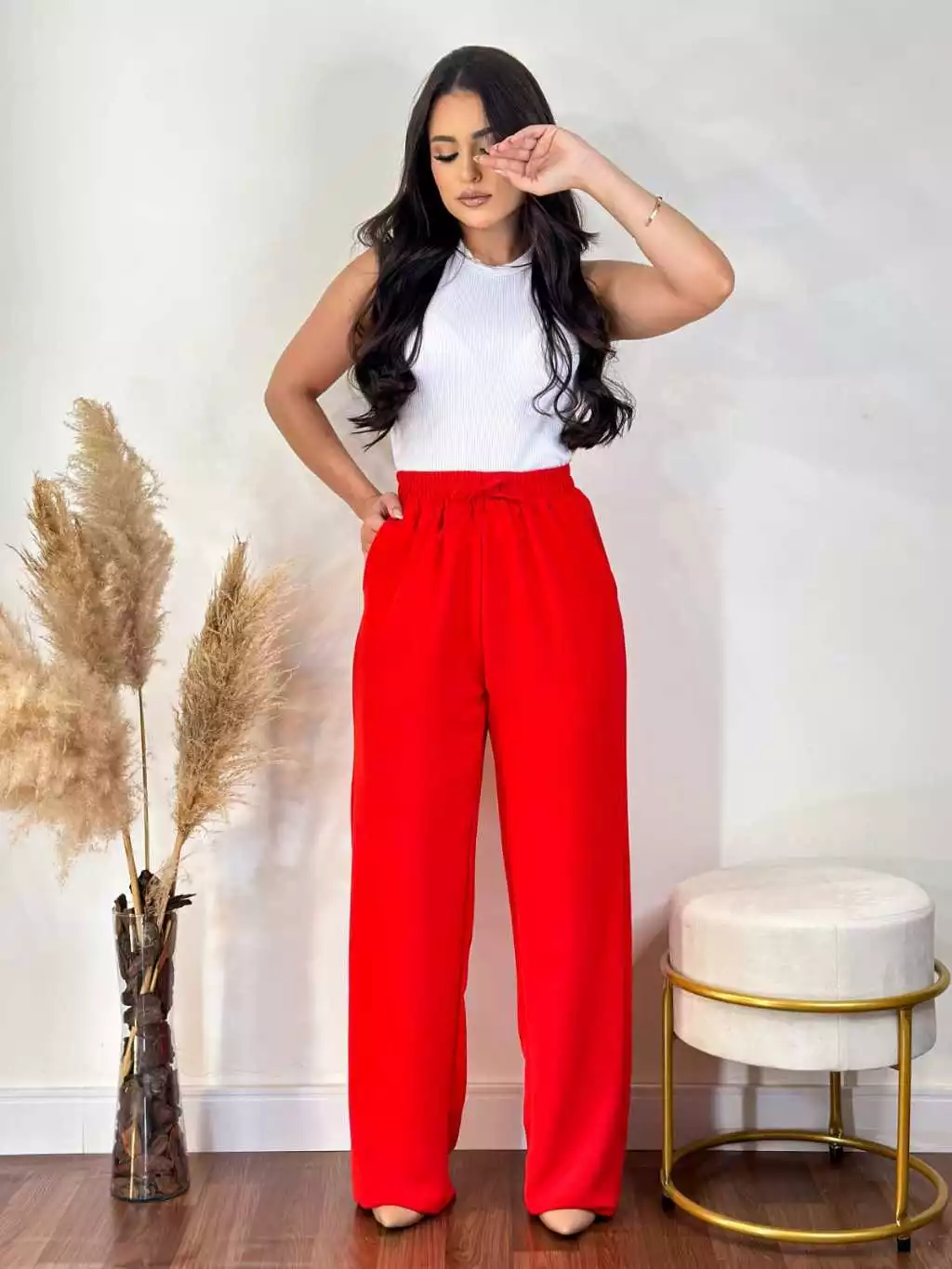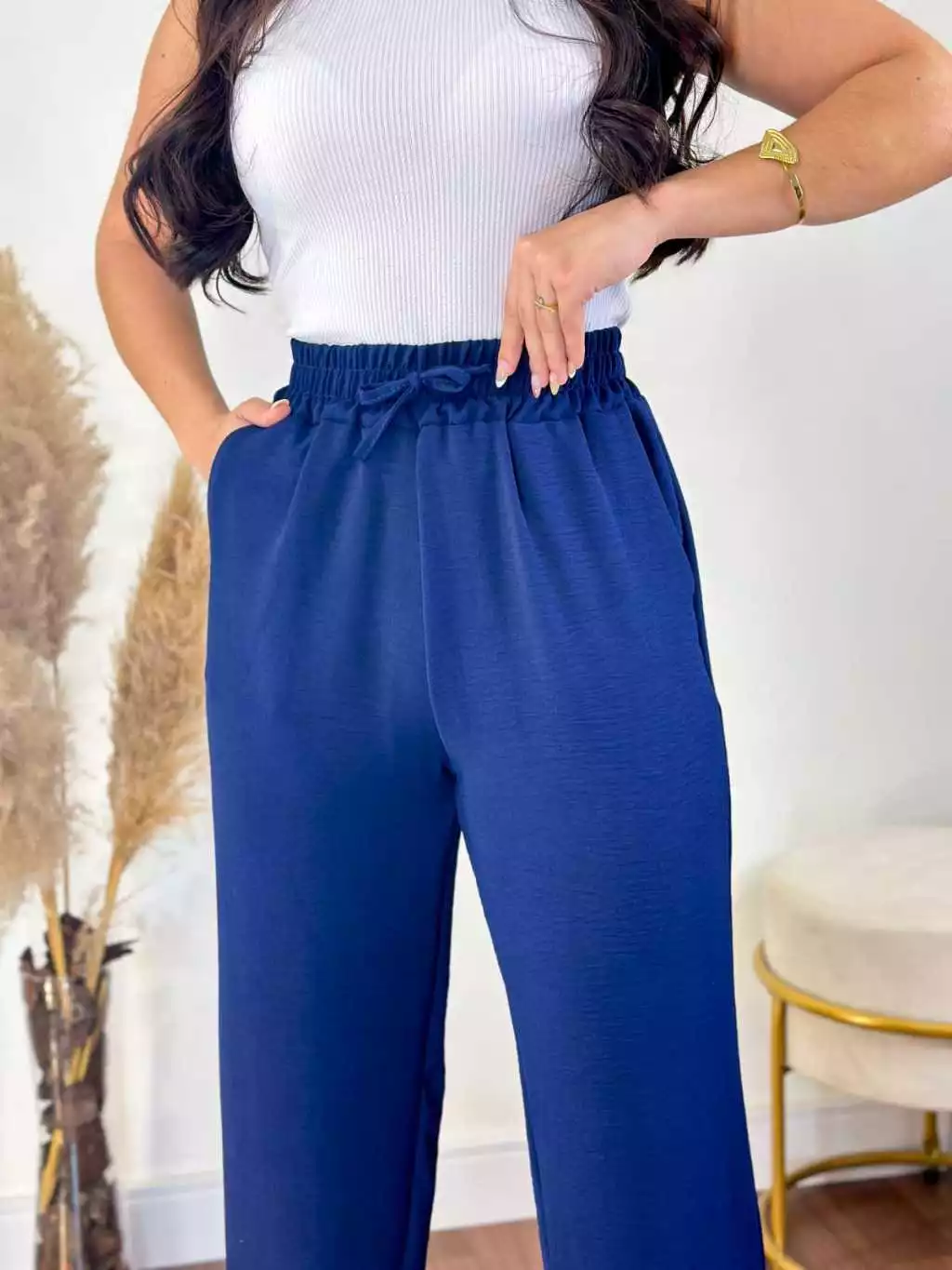 Calça Pantalona com Elástico Na Cintura Com Bolso Cintura Alta Tecido Duna