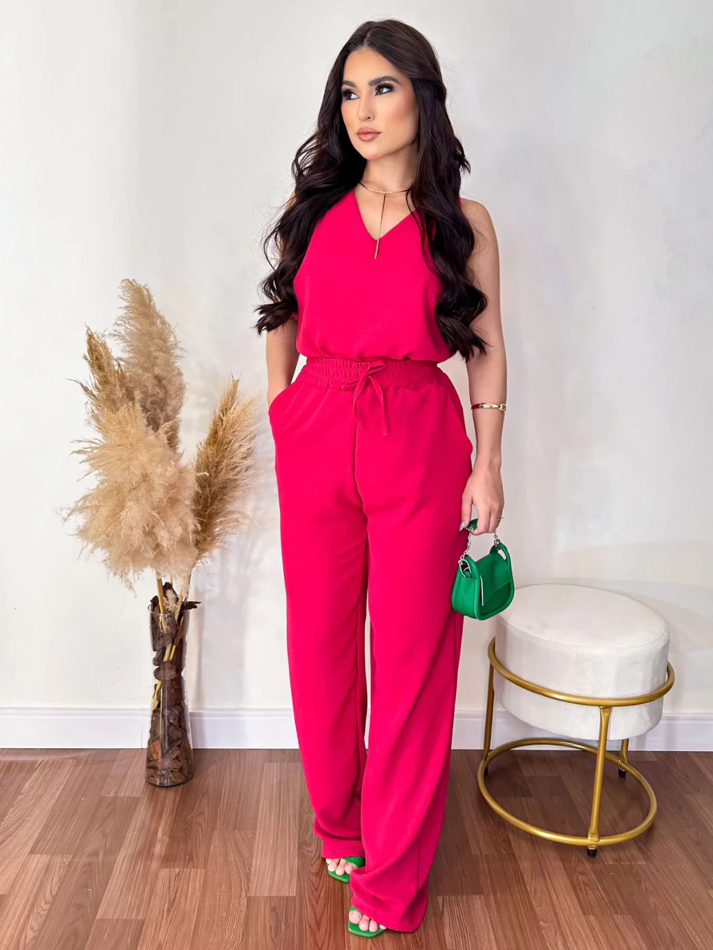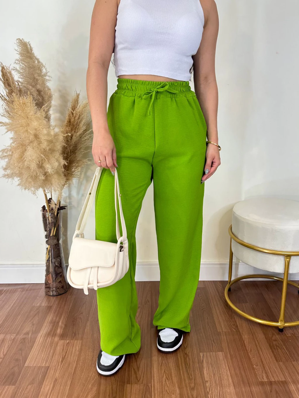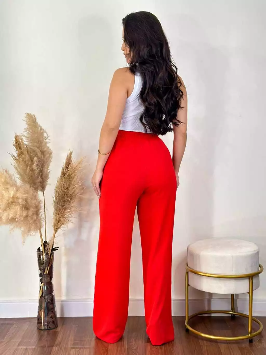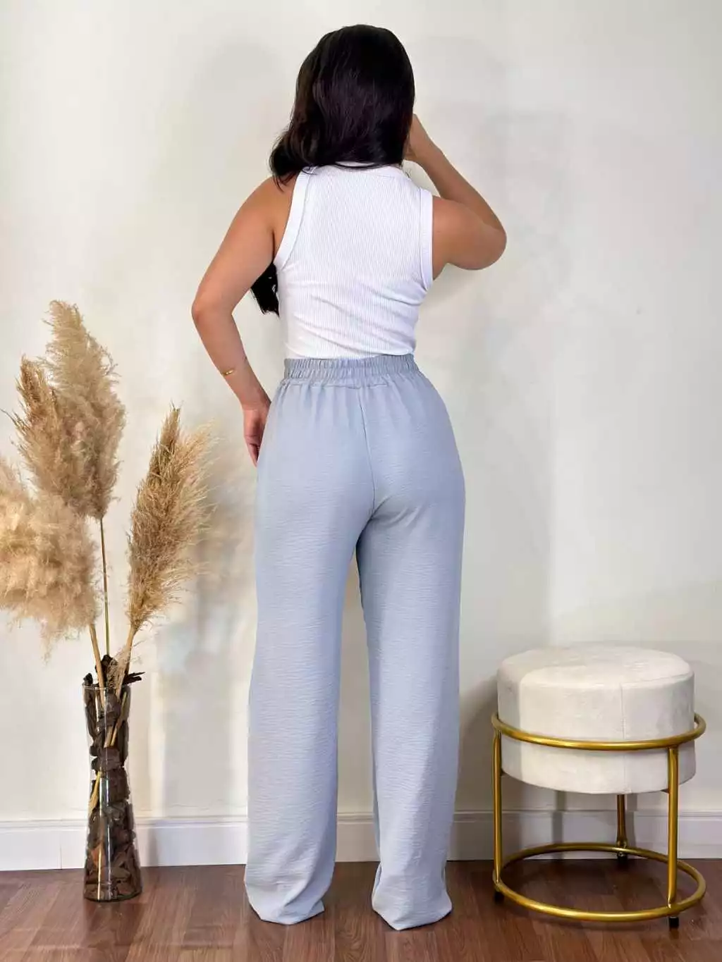 Calça Pantalona com Elástico Na Cintura Com Bolso Cintura Alta Tecido Duna