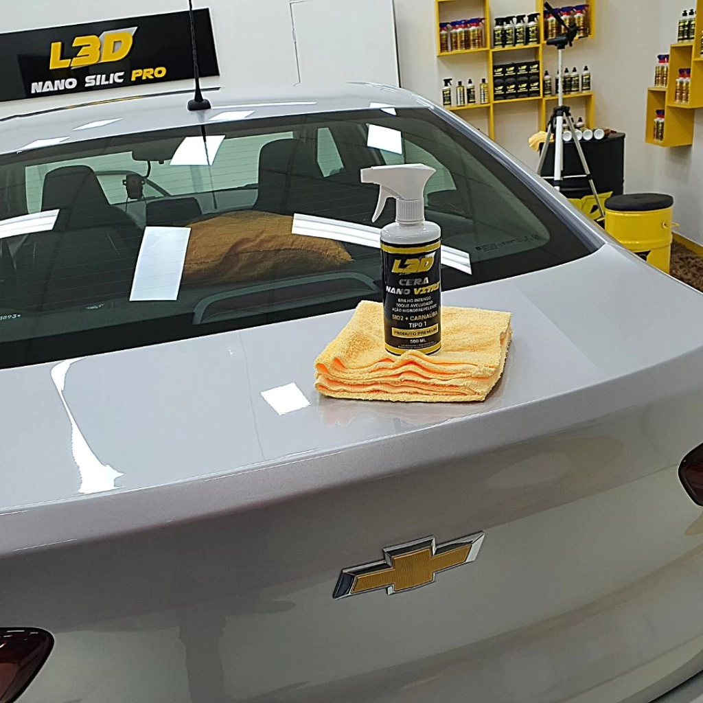 A Cera Nano Vitri L3D é indicada para qualquer tipo de cor, ano ou modelo de veículo, podendo ser aplicada na pintura e nos vidros. Sua formulação exclusiva conta com SiO₂, Carnaúba Tipo 1 e ativos de vitrificador de pintura, sendo pioneira no mercado automotivo com essa tecnologia. O resultado é brilho intenso e proteção duradoura de até 4 meses por aplicação.