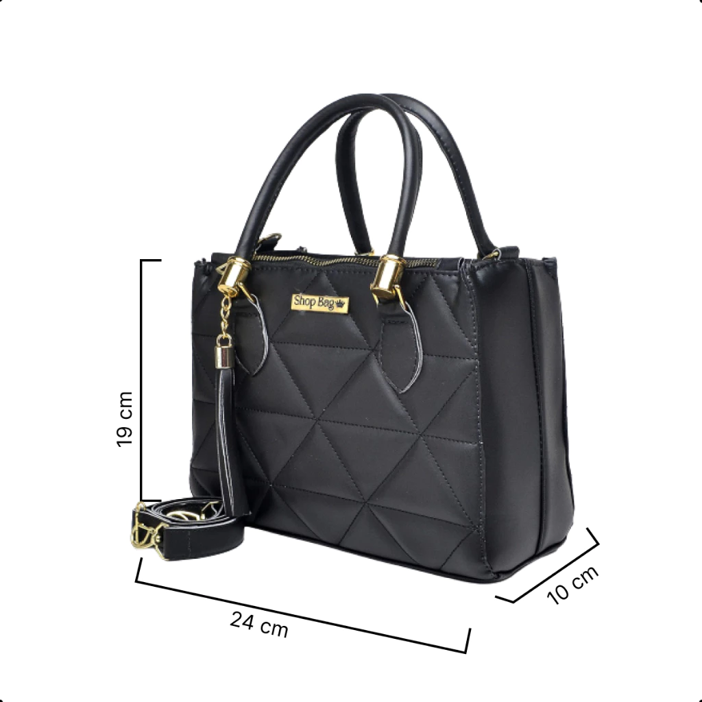 Medidas da bolsa: 24cm (comprimento) x 18cm (altura) x 10cm (largura) — comporta celular grande, chave, carteira pequena, batom, maquiagem, entre outros itens essenciais
