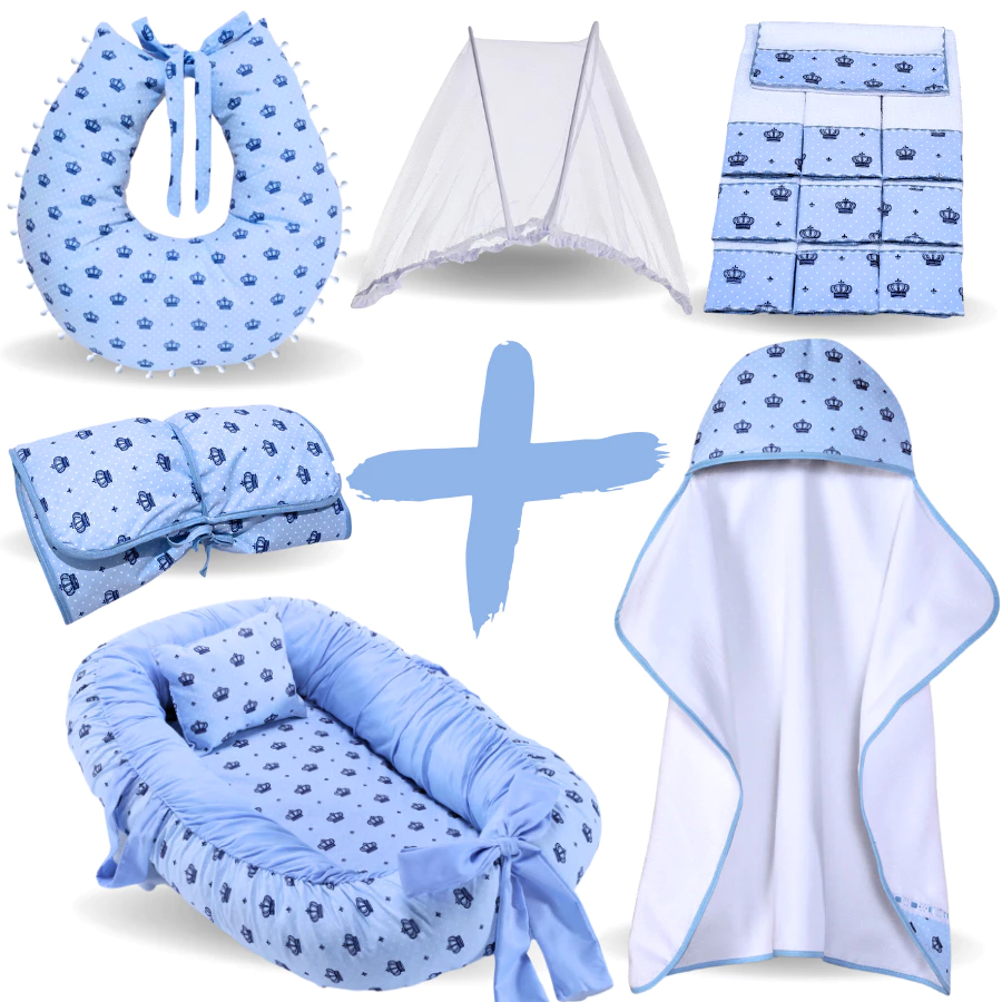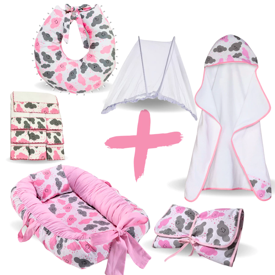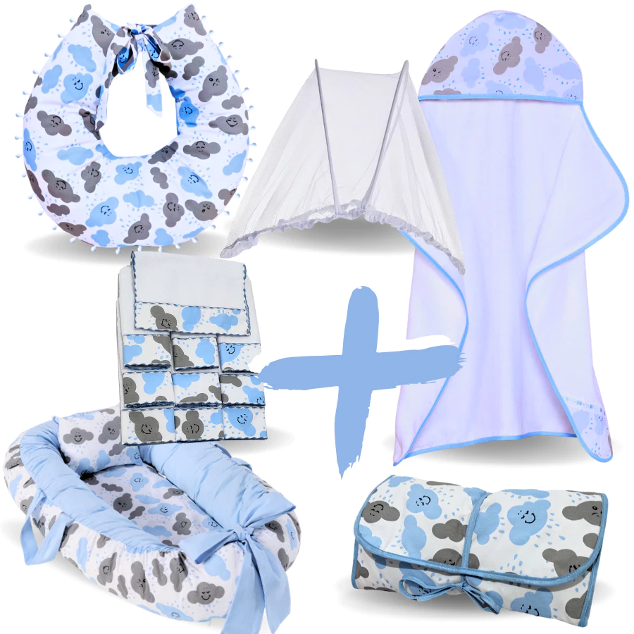 Contém ao total 12 peças, sendo elas Ninho Redutor de Berço + Travesseirinho de Apoio, Almofada Amamentação, Kit com 6 Toalhinhas de Ombro com Tecido Estampado, Toalha de Banho para Bebê com Forro Fralda, Trocador Bebê com Bolso Portátil e Mosquiteiro Portátil